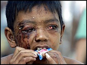 在一個(gè)個(gè)受災(zāi)國家,兒童成了這次地震引發(fā)的海嘯的最大受害者,排山倒海的巨浪卷走和淹死了成千上萬的兒童,野蠻地奪去了幾乎整個(gè)一代亞洲人的生命。