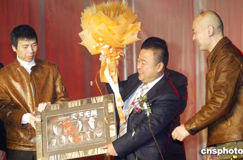 十二月三十日,中國知名家具企業(yè)——曲美家具公司在北京順義的“曲美工業(yè)園”舉行曲美二零零五經(jīng)銷商年會暨新產(chǎn)品發(fā)布會,歷屆金雞、百花獎最佳男演員得主、北京曲美家具形象代言人葛優(yōu)(右),與中國著名導(dǎo)演馮小剛(左)親臨現(xiàn)場,向北京曲美家具公司總裁趙瑞海先生(中)贈送《天下無賊》經(jīng)典劇照以表示祝賀。作者:盛佳鵬