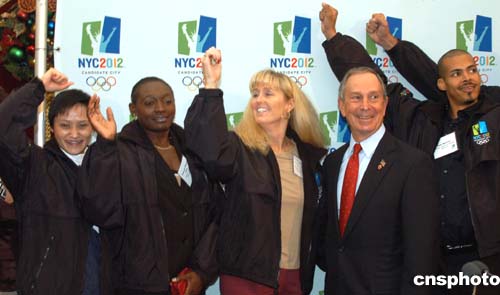 當?shù)貢r間二零零四年十二月三十一日,包括昔日中國“跳水皇后”高敏(左一)在內(nèi)的八名奧運冠軍在應(yīng)邀作為嘉賓出席紐約奧申委舉辦的紐約申辦二零一二年奧運會活動,和紐約市長布隆博格(右二)一起為紐約申奧成功加油。作者:趙海燕