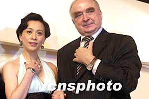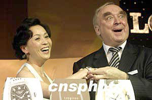 五月十三日晚,劉嘉玲現(xiàn)身北京,為瑞士斯沃琪公司旗下的著名手表品牌經(jīng)典“浪琴表典藏”系列助興。圖為劉嘉玲(左)與浪琴表全球總裁霍凱諾(右)展示新款手表。作者:高遠