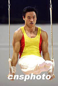 5月14日晚,中國國家體操隊隊員楊威在江蘇蘇州舉行的全國體操錦標(biāo)賽暨雅典奧運選拔賽資格賽吊環(huán)比賽中大顯身手,并以總分57.825分的成績獲得全能冠軍。中新社記者:盛佳鵬