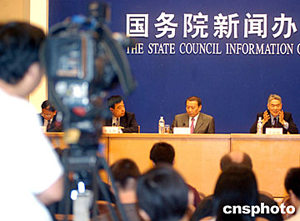 五月十九日,國務(wù)院新聞辦公室邀請(qǐng)牛軍等五名北京臺(tái)灣研究專家學(xué)者舉行記者會(huì),就“5·17受權(quán)聲明”接受中外記者采訪。中新社記者:張宇