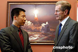 中國首位進入太空飛行的宇航員楊利偉今天下午在華盛頓會晤美國上世紀八十年代的宇航員、現(xiàn)在的國會參議員比爾·納爾遜。