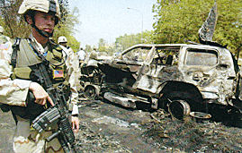 伊拉克當(dāng)?shù)貢r(shí)間5月17日上午,一列由5輛車組成的車隊(duì)駛近巴格達(dá)“綠區(qū)”駐伊聯(lián)軍總部12號(hào)檢查站,并依次通過(guò),但就在最后一輛車將要通過(guò)的時(shí)候,一輛緊挨著車隊(duì)停靠的紅色大眾小車發(fā)出轟的一聲巨響,最后的那輛轎車連同前后左右的車輛變成了一團(tuán)火球,伊拉克臨時(shí)管理委員會(huì)(簡(jiǎn)稱臨管會(huì))輪值主席薩利姆就在那輛車上。