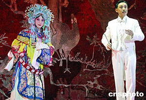 為紀(jì)念中國(guó)最著名的京劇大師梅蘭芳先生誕辰一百一十周年,北京京劇院演出的京劇大型交響劇詩(shī)《梅蘭芳》五月二十五日晚走進(jìn)北京大學(xué)百年講堂,如詩(shī)如畫的舞臺(tái)設(shè)計(jì)和京劇藝術(shù)家們精湛的演技贏得大學(xué)生的陣陣喝彩。京劇大型交響劇詩(shī)《梅蘭芳》擷取了抗日戰(zhàn)爭(zhēng)期間梅蘭芳蓄須明志,拒絕為日本人演出的人生片段。圖為由北京京劇院于魁智(右)扮演的梅蘭芳先生。中新社記者:張勤
