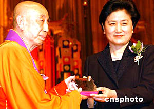國家宗教局局長(zhǎng)葉小文、中國佛教協(xié)會(huì)會(huì)長(zhǎng)一誠法師,五月二十六日在香港會(huì)展中心舉行的香港佛教暨各界迎請(qǐng)佛指舍利瞻禮祈福大會(huì)儀式上,向香港特首董建華贈(zèng)送紀(jì)念品。 作者:錢興強(qiáng)