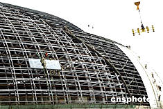 國家大劇院橢球屋面的中央,是由兩條不規(guī)則漸開曲線圍成的弧形玻璃幕墻和穹頂,雖然玻璃還沒有安裝上去,但是整個構(gòu)造還是如同一簾拉開的幕布。據(jù)國家大劇院金屬屋面及幕墻工程的總指揮羅憶介紹,當(dāng)天要安裝的就是裝點這塊“幕布”的玻璃,這些玻璃是國家大劇院的最外層的幕墻玻璃,也是整體景觀效果最明顯的部分。