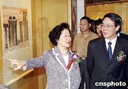 藝術(shù)大師方召麟博士書(shū)畫(huà)作品展暨捐贈(zèng)儀式五月三十日在江蘇無(wú)錫舉行。方召麟長(zhǎng)女、香港特區(qū)政務(wù)司原司長(zhǎng)陳方安生(左)及方氏家族親屬,代表方召麟向江蘇無(wú)錫市政府捐贈(zèng)六十件書(shū)畫(huà)精品。作者:顧祚維