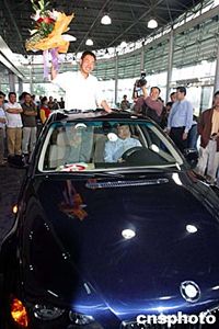 隨著陜西西安“體育彩票造假案”全案告破,六月四日下午,陜西省西安市體彩中心負(fù)責(zé)人宣布劉亮于三月二十三日所獲特等A獎(jiǎng)彩票有效,并向其當(dāng)面交付所中得的寶馬轎車。同時(shí),陜西省、西安市體育局負(fù)責(zé)人向劉亮公開道歉。圖為劉亮喜獲寶馬車后的情形。作者:李宗文