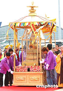 恭送佛指舍利儀式五日在香港國(guó)際機(jī)場(chǎng)停機(jī)坪舉行,圖為工作人員在啟運(yùn)儀式上。中新社記者:趙振清