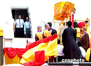 香港覺光法師五日上午十時(shí)四十分在香港國(guó)際機(jī)場(chǎng)登上恭送專機(jī),恭送佛指舍利離港。中新社記者:趙振清