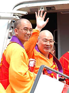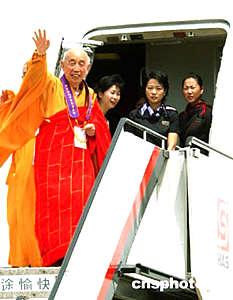 中國(guó)佛教協(xié)會(huì)副會(huì)長(zhǎng)圣輝法師五日上午在香港國(guó)際機(jī)場(chǎng)登上恭送佛指舍利專機(jī),護(hù)送佛指舍利回法門寺。中新社記者:趙振清
