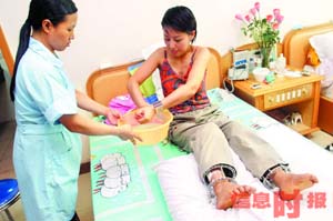 管小姐手拿著一把扳手,一絲不茍地?cái)Q著套在腳上的螺絲,極像一個(gè)修理機(jī)器的工人。擰完螺絲之后,又在醫(yī)生護(hù)士的扶助下,握著腳手架在房間里來(lái)回移動(dòng)。據(jù)管小姐介紹,手術(shù)的第二天,她就把身上的鎮(zhèn)痛棒拆除了。但是腳部仍然無(wú)法動(dòng)彈,幾天來(lái)一直只能躺在病床上,腳部總感到脹痛,尤其是晚上翻身時(shí),膝部總感到一股鉆心的疼痛,F(xiàn)在每天要打一次消炎針和喝一碗骨頭湯。“很多人都想知道她手術(shù)后想找一個(gè)什么樣的男友,而我從來(lái)就沒(méi)有想過(guò),如果對(duì)一個(gè)打工仔有感覺(jué),也會(huì)嫁給他!惫苄〗闾寡缘馈