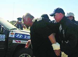 兩車被從中斷開。路虎突然陷入沙坑中,左側(cè)車身懸空。同一時(shí)刻,“桑塔納”被兩輛警車左右夾擊。從車內(nèi)跳下三個(gè)人,一人手持菜刀,朝一警察當(dāng)頭劈去;另一穿白色T恤的胖大男子一面跑,一面舉起槍,朝后射擊;另一人下了車就聲嘶力竭地喊,“別抓我,不是我干的”。胖大男子依靠手中的槍沖破了兩道防線,可未料到腳下“有絆”,被一名警察的俯沖式臥倒絆倒。