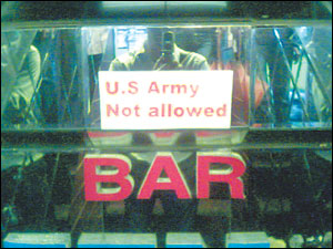 一些酒吧的老板也承認(rèn)這樣做帶有歧視色彩,但除此之外他們也沒有別的辦法。他們必須在警察趕到前制止打架,否則酒吧就會(huì)被關(guān)閉。在采取不讓美國(guó)大兵進(jìn)酒吧的政策后,酒吧現(xiàn)在不再有麻煩了。