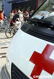 二○○四年六月七日,全國統(tǒng)一高考北京地區(qū)各考場外,特別為考生設置了醫(yī)療服務急救專用車,以確保高考順利進行。中新社記者:張勤