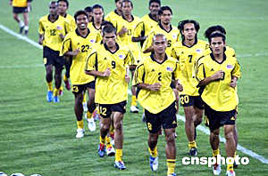 六月八日,馬來西亞足球隊(duì)在天津泰達(dá)足球場(chǎng)進(jìn)行適應(yīng)場(chǎng)地訓(xùn)練。二零零六年世界杯足球賽亞洲區(qū)預(yù)賽中國隊(duì)對(duì)馬來西亞隊(duì)的比賽將于六月九日晚在這里舉行。中新社記者:毛建軍