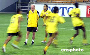 六月八日,馬來西亞足球隊(duì)在天津泰達(dá)足球場(chǎng)進(jìn)行適應(yīng)場(chǎng)地訓(xùn)練。二零零六年世界杯足球賽亞洲區(qū)預(yù)賽中國隊(duì)對(duì)馬來西亞隊(duì)的比賽將于六月九日晚在這里舉行。圖為馬來西亞主教練哈里斯正對(duì)隊(duì)員進(jìn)行現(xiàn)場(chǎng)指導(dǎo)。中新社記者:毛建軍