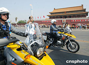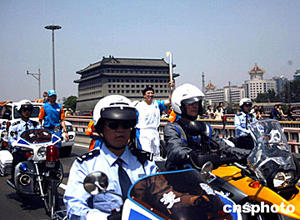 六月九日,二○○四年雅典奧運(yùn)火炬北京接力從人民大會堂東門外廣場起程,將經(jīng)過一百四十八名火炬手傳遞五十五公里到達(dá)終點(diǎn)頤和園。圖武警國旗護(hù)衛(wèi)隊(duì)?wèi)?zhàn)士阮野在雅典奧運(yùn)火炬護(hù)衛(wèi)騎警的護(hù)衛(wèi)下跑過天安門。中新社記者:鄭萍萍