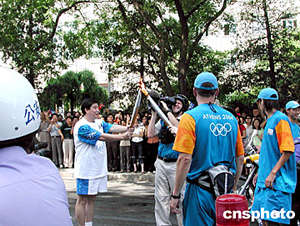 六月九日上午,二○○四年雅典奧運火炬北京接力活動開始。圖為中國射擊老將王義夫在接傳火炬。作者:宋海濤