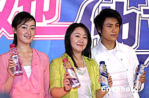 六月九日,中國內(nèi)地當紅小生陳坤(右)和中央電視臺主持人趙琳(左)在北京為某飲料擔任形象代言人。作者:高遠