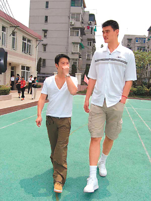 黎明和姚明首次碰頭,黎明六尺身高,本來個子已相當(dāng)標(biāo)準(zhǔn),但站在昂藏七尺五高度的姚明旁邊,黎明立即顯得矮了一截,縱使黎明踮高腳也只是到姚明的膊頭,黎明需要仰望才能跟姚明交談,結(jié)果弄得膊頭酸痛。