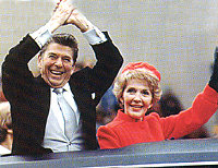 里根于1980年贏得了共和黨總統(tǒng)候選人提名,他選擇了時任美國駐聯(lián)合國大使的布什(1988年當選美國為總統(tǒng),現(xiàn)任美國總統(tǒng)布什的父親)作他的競選伙伴。飽受通貨膨脹折磨和長時間受伊朗革命困擾的美國人把大多數(shù)選票投給了里根,他奇跡般地贏得了489張選舉人票中的440票,從而以壓倒性勝利擊敗了民主黨總統(tǒng)卡特。1984年,里根再次以前所未有的選票贏得競選連任。