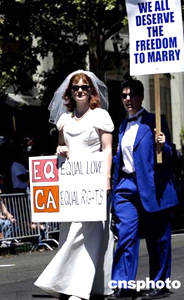 美西加州圣荷西市六月十三日舉行第二十九屆同性戀游行,一對同性伴侶手舉“我們都有權(quán)自由結(jié)婚”、“同樣的愛、同等的權(quán)利”標語牌參加游行。目前,麻塞諸塞州是美國唯一批準同性伴侶婚姻合法的州。作者:陳鋼