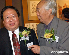 “邵華澤、李琦、馮真書畫展”六月十四日在香港大會堂開幕,香港民政事務局局長何志平與畫家李琦在展會上。中新社記者:錢興強