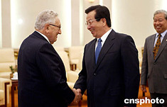 中國國家副主席曾慶紅六月十五日在北京人民大會(huì)堂會(huì)見前來出席“和平共處五項(xiàng)原則國際研討會(huì)”的美國前國務(wù)卿基辛格。中新社記者:毛建軍