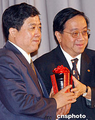 中央人民政府外交部駐香港特別行政區(qū)特派員公署特派員楊文昌,六月十五日出席香港福建中學(xué)舉行的“楊文昌特派員與你真情對(duì)話”活動(dòng),圖為該校校監(jiān)黃光漢向楊文昌贈(zèng)送紀(jì)念品。中新社記者:錢興強(qiáng)