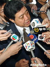 中央人民政府外交部駐香港特別行政區(qū)特派員公署特派員楊文昌,六月十五日在香港福建中學(xué)與學(xué)生對(duì)話,并發(fā)表演講。圖為楊文昌在活動(dòng)上接受香港傳媒采訪。中新社記者:錢興強(qiáng)