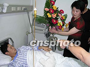 六月十六日中午 ,江西省廣豐縣政府一行六人專程赴濟慰問正在山東省立醫(yī)院接受救治的在阿受傷工人。圖為廣豐縣副縣長祝美清(持花者)在看望受傷的江西籍工人徐啟松。作者:胡洪林