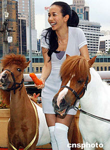 香港歌星莫文蔚,六月十七日出席“2003/2004香港賽馬會(huì)冠軍人馬頒獎(jiǎng)典禮”打氣活動(dòng),在跑馬地馬場(chǎng)兩只可愛的雪特蘭小馬向她致送薄荷糖。中新社記者:錢興強(qiáng)