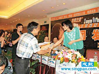 中新網(wǎng)6月18日電 據(jù)香港大公報(bào)報(bào)道,王菲將首次在西安舉行個(gè)人演唱會(huì)。在記者會(huì)上,有十名之前玩游戲勝出的歌迷,可以進(jìn)入記者會(huì)見偶像,期間有一名男士竟寫了一首詩公然向“阿菲”示愛。