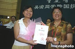 六月二十二日,重慶市紅十字會副會長周清梅向吳渝頒發(fā)骨髓捐獻證書。作為中國跨國捐獻骨髓第一人,來自重慶醫(yī)科大學(xué)的吳渝將于六月二十三日啟程前往北京采集造血干細胞。作者:郭晉嘉