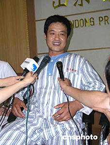 因阿富汗恐怖襲擊事件受傷的四位人員中的兩位輕傷者蔣昌泉和王金生,六月二十二日在山東省立醫(yī)院與各路媒體見(jiàn)面。經(jīng)過(guò)醫(yī)院醫(yī)護(hù)人員七天的精心治療和細(xì)心護(hù)理,兩人基本痊愈。圖為山東諸城的受傷工人王金生。作者:胡洪林