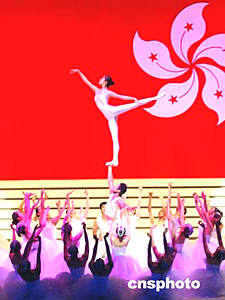 中國人民解放軍藝術(shù)團(tuán)運(yùn)用雜技的托、拋、翻等高雅技巧和西方芭蕾相稼接,向香港觀眾獻(xiàn)上驚險、刺激、漂亮的〈東方天鵝〉。中新社記者:趙振清
