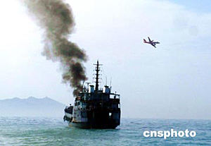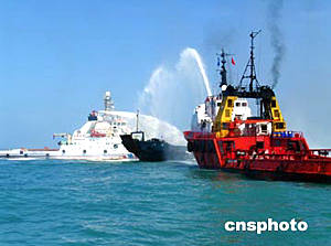 今天參加聯(lián)合搜救演習(xí)的船只共有二十九艘、另有香港飛行服務(wù)隊兩架飛機參加行動。按照演習(xí)預(yù)定的項目,假設(shè)在南海某一海域發(fā)生船舶爆炸起火事故,十二名船員棄船逃生,船上有燃油溢出污染海面;另一艘船舶沉沒,十余名船員落水。海南省海上搜救中心接到報告后,立即啟動應(yīng)急搜救程序,隨即展開了一場海陸空全方位的海上搜尋救助、海上消防滅火和海上溢油應(yīng)急行動。結(jié)果成功營救了所有落水船員,并對遇險船只進行了消防、對海面進行了清理污染的行動。