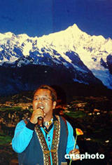七月四日晚,參加情系香格里拉——兩岸文化聯(lián)誼行活動(dòng)的兩岸四地文化界人士在香格里拉與迪慶州文藝界人士歡聚一堂,交流文化,增進(jìn)友誼。圖為來自臺(tái)灣原住民文化推廣協(xié)會(huì)理事長麥村連先生登臺(tái)演唱。中新社記者:武仲林