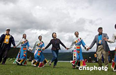 七月四日,參加情系香格里拉——兩岸文化聯(lián)誼行活動(dòng)的兩岸四地文化界人士來到美麗的云南香格里拉屬都湖,體驗(yàn)藏族鍋莊舞的自然、豪放。中新社記者:武仲林