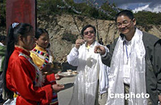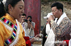 七月五日,參加情系香格里拉——兩岸文化聯(lián)誼行活動(dòng)的兩岸四地文化界人士來到德欽,受到當(dāng)?shù)夭刈逋臒崃覛g迎。圖為臺(tái)灣金門縣縣長李炷烽先生品嘗藏族姑娘敬獻(xiàn)的青稞酒。中新社記者:武仲林