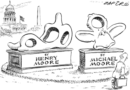 中新網(wǎng)7月5日電 約翰內(nèi)斯堡媒體Mail & Guardian近日刊登了這副漫畫(huà),向讀者展示了兩件藝術(shù)作品:一個(gè)是邁克爾·摩爾的電影《華氏911》,一個(gè)是雕塑家亨利·摩爾的雕塑作品《沉睡中的女人》。
