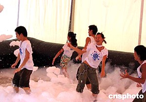 香港海洋公園在盛夏時(shí)節(jié)推出全新游戲節(jié)目“夏水禮”,吸引游客蒞臨。圖為7月7日充滿活力的年輕舞者在“泡泡舞池”聞歌起舞,帶動(dòng)熱鬧氣氛。作者:李炘