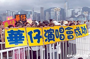 歌影紅星劉德華7月8日在香港尖沙咀星光大道舉行《道地百果園劉德華Vision Tour演唱會(huì)2004》記者會(huì),大批“華仔”歌迷帶備標(biāo)語(yǔ)到場(chǎng)支持,為偶像打氣。作者:鄧慶樂(lè)