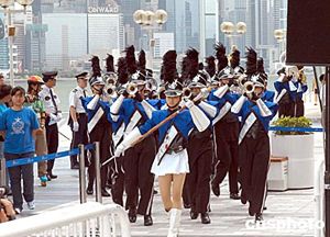 步操團(tuán)奏樂(lè)表演為記者會(huì)助聲勢(shì)。歌影紅星劉德華7月8日在香港尖沙咀星光大道舉行《道地百果園劉德華Vision Tour演唱會(huì)2004》記者會(huì),大會(huì)特意安排步操團(tuán)奏樂(lè)表演,為記者會(huì)助聲勢(shì)。作者:鄧慶樂(lè)