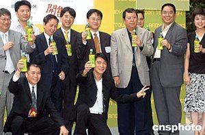 歌影紅星劉德華7月8日在香港尖沙咀星光大道舉行《道地百果園劉德華Vision Tour演唱會(huì)2004》記者會(huì),劉德華與演唱會(huì)主辦機(jī)構(gòu)高層、贊助商及各大傳媒嘉賓會(huì)上以綠茶代酒預(yù)祝演唱會(huì)舉辦成功。作者:鄧慶樂(lè)