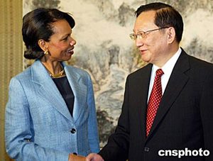 唐家璇對賴斯說,你在美國外交決策方面起著不同尋常的重要作用,而且一直非常關(guān)心并致力于推動中美關(guān)系的發(fā)展。我們對此表示贊賞。中方非常重視此次訪問。我希望并相信此次訪問將會有助于下一階段中美關(guān)系的健康發(fā)展。