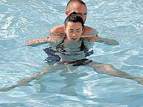 游了15分鐘,匿在太陽傘后的Brochard才在她的三催四請(qǐng)下,跳入水中與她來個(gè)鴛鴦戲水。只見身材健碩的他不斷抱起纖瘦的女友,而Maggie則不停哈哈地笑,笑容甜得像個(gè)初戀的少女。