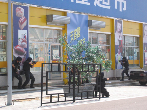 在模擬街區(qū)破襲劫案中,場內(nèi)觀摩人士皆有身臨其境之感。三名蒙面持槍和爆炸物的“歹徒”從黑色小轎車魚貫跳下,闖入銀行內(nèi)進行搶劫,隨著一聲槍響,模擬街區(qū)銀行搶劫案發(fā),民眾慌亂撤離,“歹徒”搶劫得逞后駕車逃離現(xiàn)場。特警隊員接到報警后迅速趕到現(xiàn)場。最先趕到的步巡小組和陸續(xù)到達的巡邏車組相互配合,開展堵截。犯罪嫌疑人開槍拒捕,逃到一家商店內(nèi)繼續(xù)與警方對抗。警方包圍商店后,特警采取各種單兵和小組戰(zhàn)術(shù)接近商店,選擇時機向屋內(nèi)投擲爆震彈并迅速出擊,同時抓獲犯罪嫌疑人。